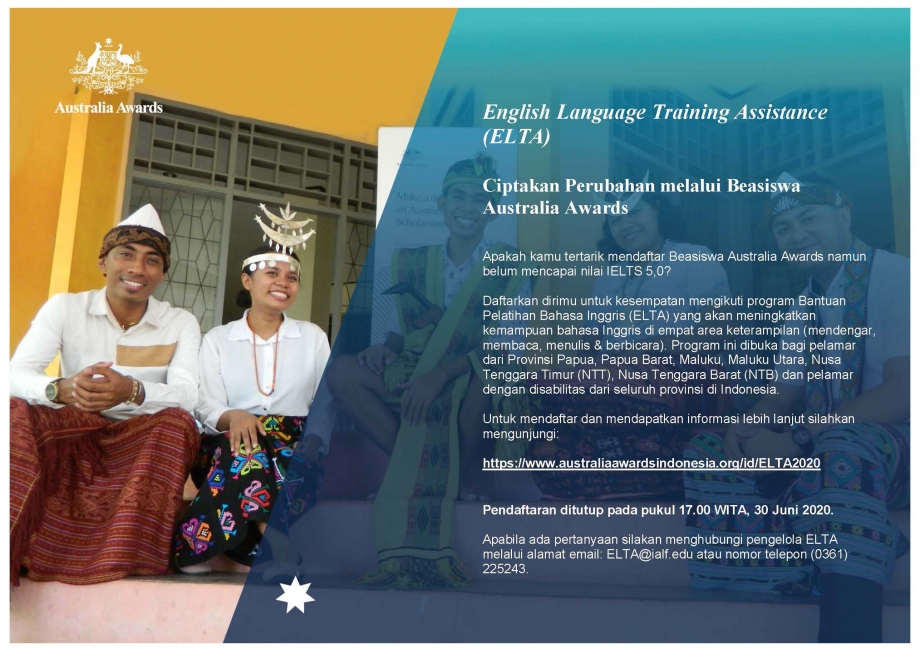 Apply now and get the chance to join the English Language Training Assistance (ELTA) to enhance your English language skills (listening, reading, writing, and speaking). The program is open to applicants from Papua, West Papua, Maluku, North Maluku, East Nusa Tenggara, West Nusa Tenggara, and applicants with disabilities from all provinces in Indonesia. Submit your applications before 22 May at 5.00 PM WITA at this link.