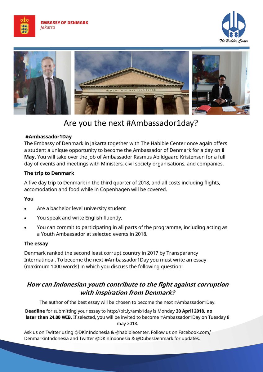 The Embassy of Denmark in Jakarta together with The Habibie Center once again offers a student unique opportunity to become the Ambassador of Denmark for a day. You will take over the job of Ambassador Rasmus Abildgaard Kristensen for a full day of events and meetings.