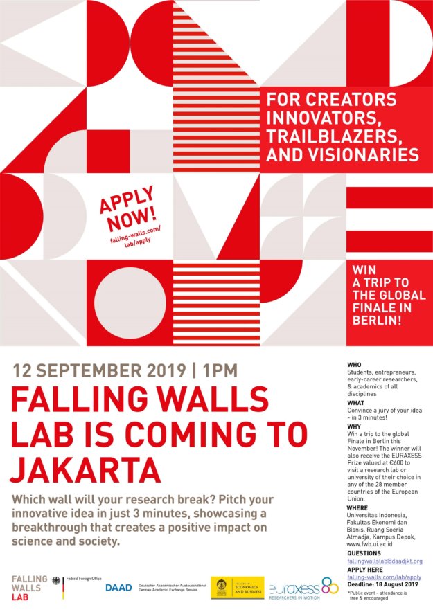 Falling Walls Lab Jakarta 2019 will be held at Fakultas Ekonomi dan Bisnis, Universitas Indonesia kampus Depok, on 12 September 2019. To get more infomation please take a look at the image below.