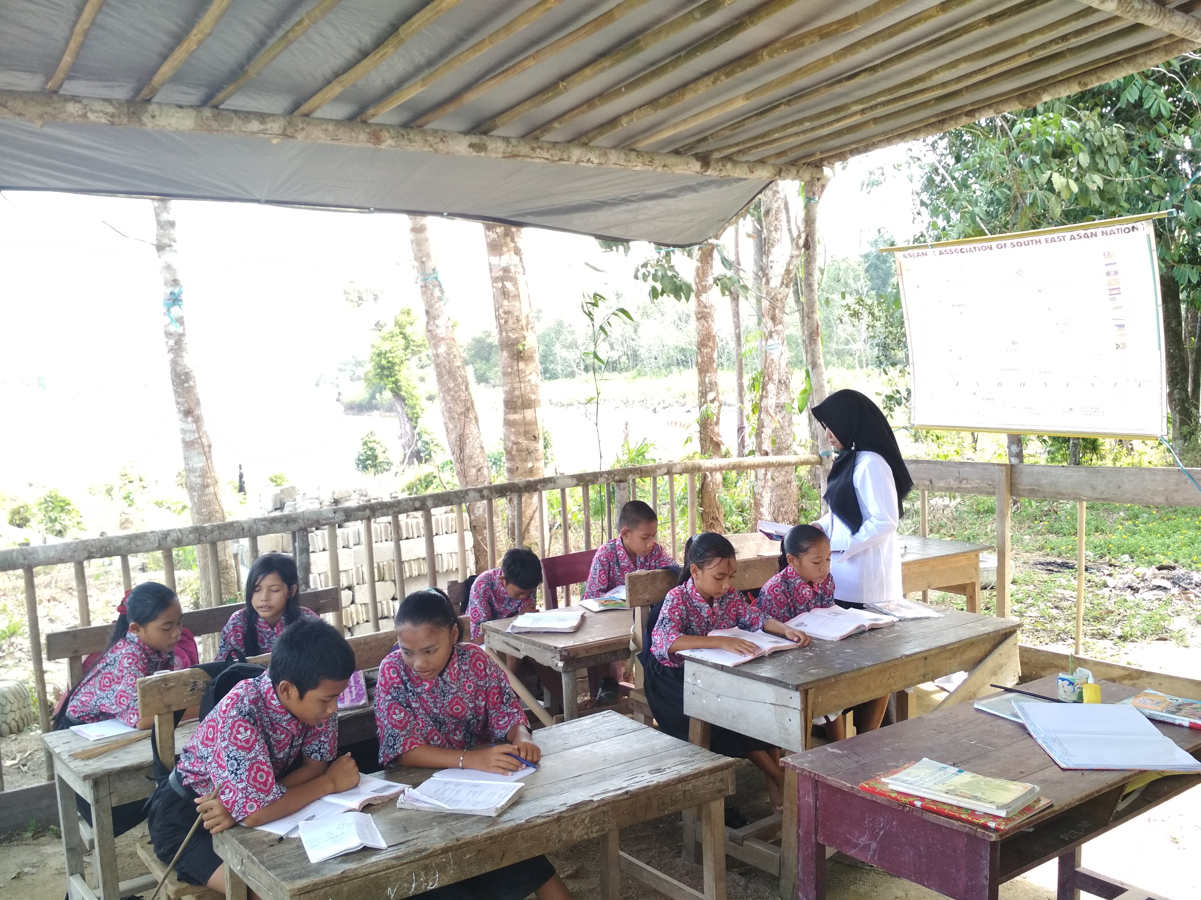 Siang itu-ditemani Kader Desa Batu Sedau, bernama Dewi, kami berjalan menyusuri jembatan dan memasuki lapangan sekolah. Dari jauh nampak biasa saja, setelah mendekat, mata saya tertuju pada sebuah tenda di samping dinding kantor sekolah. Terlihat jelas seorang guru yang kemudian saya tahu bernama Ibu Rusma bersama siswa didiknya di kelas lima sedang asik belajar.