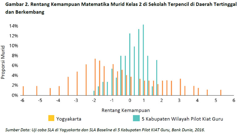 SLA telah diujicobakan dan diujikan ke 64.565 murid dari 324 sekolah dasar terpencil di delapan provinsi di Indonesia. Uji coba SLA mencakup sekolah-sekolah daerah terpencil baik di kabupaten yang berkembang maupun tertinggal. Gambar 1 menunjukkan hasil uji coba di tingkat kelas 1, di mana distribusi hasil membaca untuk murid di 270 sekolah terpencil yang didukung KIAT Guru tersebar lebih merata di seluruh rentang kemampuan. Akan tetapi, tes ini lebih mudah bagi murid dari sekolah-sekolah terpencil di Daerah Istimewa Yogyakarta yang merupakan wilayah yang berkembang, dengan rentang hasil tes kemampuan mereka berkisar dari menengah hingga tinggi. Tren ini juga berlaku untuk murid kelas 1 di bidang matematika, seperti yang digambarkan pada Gambar 2, dan di tingkat kelas lainnya.