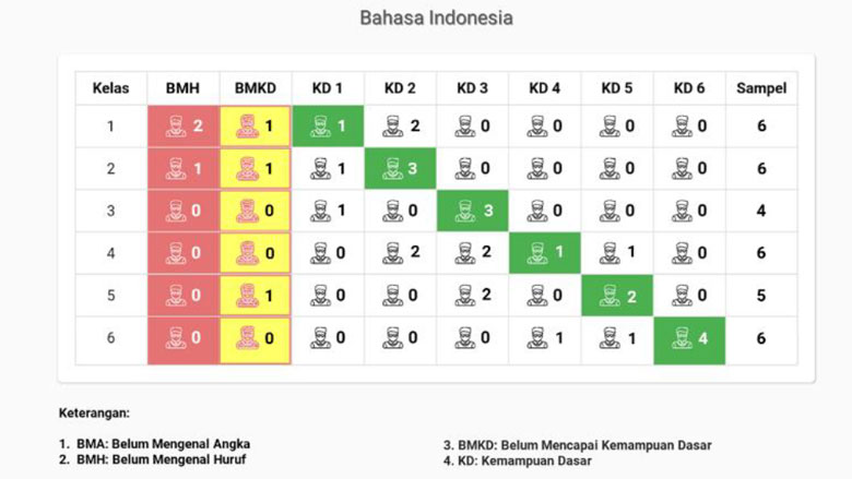 Dari masing-masing tingkat kelas, enam murid dipilih secara acak untuk mewakili kemampuan tingkat kelas mereka, dengan pemilihan yang memastikan keseimbangan secara gender. Pertanyaan tersulit yang dapat dijawab oleh murid menandai kompetensi tingkat kemampuan mereka. Hasil tes murid dipetakan ke dalam peta visual (Gambar 3) yang menunjukkan tingkat kemampuan yang mereka peroleh di sepanjang proses belajar. Jika keterampilan murid berada sesuai dengan tingkat kelasnya, maka ia dicatat dalam kotak berwarna hijau. Murid yang tertinggal tercatat di sebelah kiri kotak hijau, begitu pula mereka yang belum mengenal huruf atau belum mengenal angka. Tabel 1 menyajikan contoh hasil Tes Cepat dari suatu sekolah.