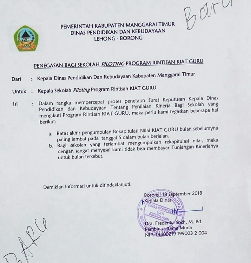 Kedua, Dinas Pendidikan akan menjadikan sekolah sekolah program KIAT Guru yang sekarang ini sudah berjalan dengan baik seperti SDI Bea Nanga, Kembang Lala dan Mboeng akan di jadikan sekolah model dan rujukan bagi sekolah peserta replikasi untuk melakukan studi banding.