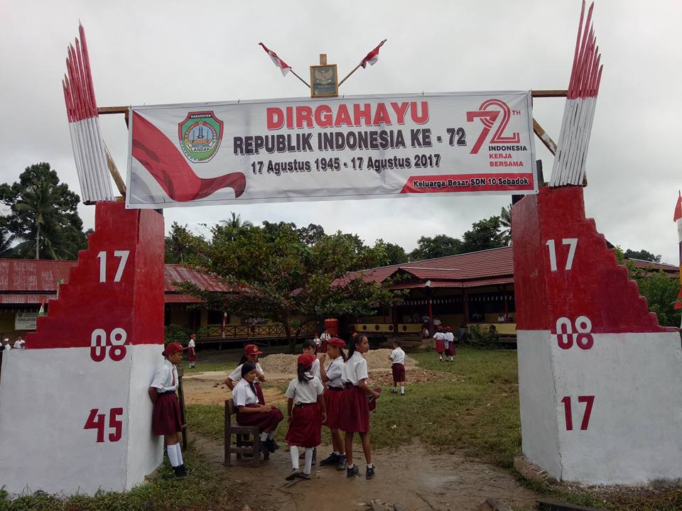 Perjalanan pagi hari ini, 17 Agustus 2017 menuju ke salah satu desa terpencil untuk Bersama-sama mengibarkan sang saka merah putih di pelosok, di tengah-tengah perjalanan yang cukup jauh dari pemukiman warga terlihat pintu gerbang yang terlukis indah nan bertuliskan “DIRGAHAYU RI KE 72” dengan background merah putih. Ketika itu, sesaat berhenti dan seolah tidak percaya di pedalaman ada tangan-tangan kreatif yang bisa berkarya begitu indah yang sengaja dibuat sebagai persembahan menyambut hari ulang tahun kemerdekaan dan melalui tulisan itu menunjukkan wujud kecintaanya kepada NKRI. Rasa kagum terus mengiringi perjalanan, dimana ketika sampai di tempat upacara melihat gerbang sekolah dasar (SDN 10 Sebadok) yang lukisannya tidak kalah saing dari gerbang yang dijumpai sebelumnya.