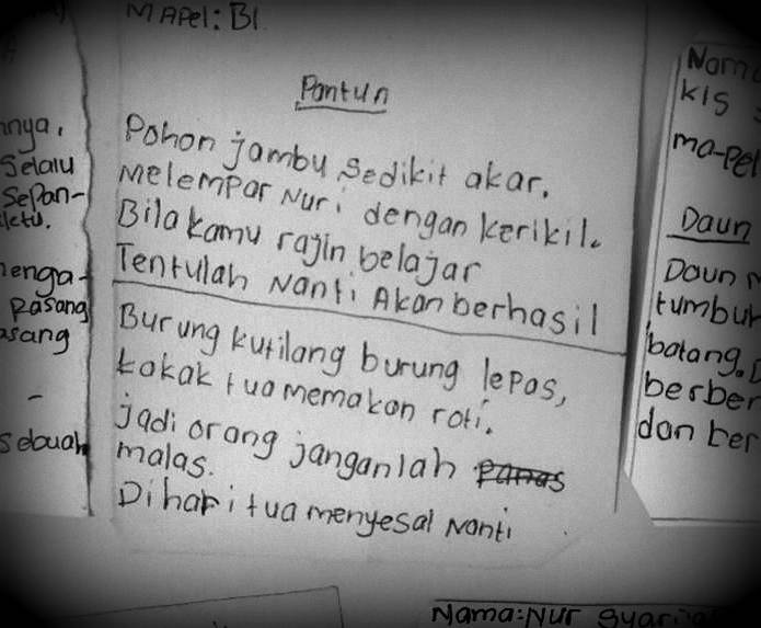 Begitulah beberapa coretan sederhana yang dibuat oleh murid yang ditempel bersama catatan lainnya di sebuah kertas karton biru yang terpampang di jendela kelas yang dijadikan media belajar oleh sekolah.