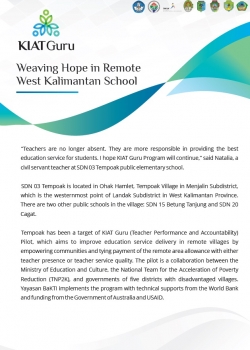 Tempoak has been a target of KIAT Guru (Teacher Performance and Accountability) Pilot, which aims to improve education service delivery in remote villages by empowering communities and tying payment of the remote area allowance with either teacher presence or teacher service quality. The pilot is a collaboration between the