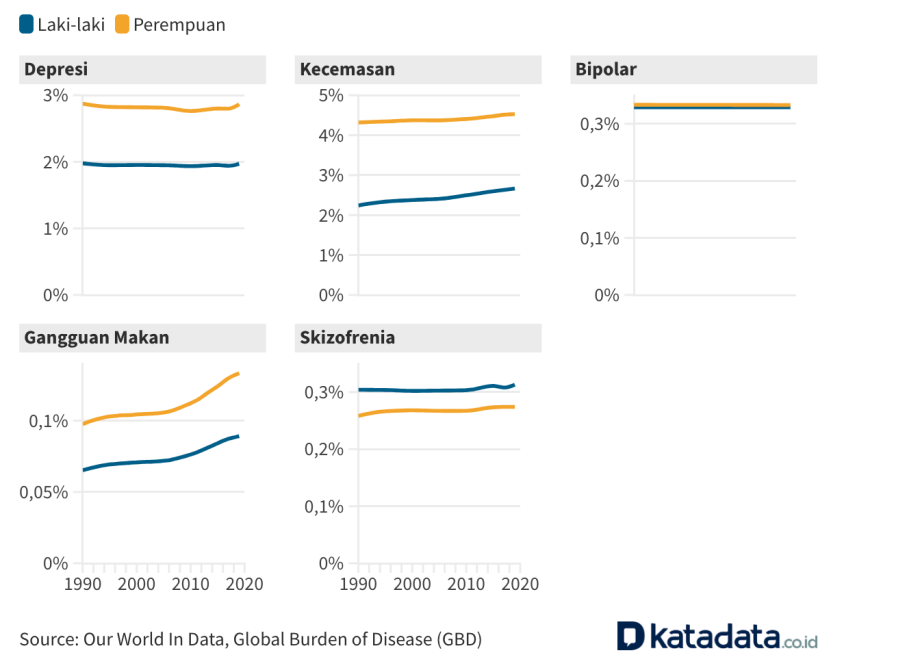 Gangguan kesehatan mental di Indonesia cenderung meningkat dalam tiga dekade, terutama pada perempuan yang mengalami depresi, kecemasan, dan gangguan makan