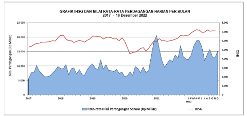 Pada 30 Desember 2022, IHSG telah berada di posisi 6.850,62 poin atau berhasil tumbuh sebesar 4,09 persen secara year-to-date. Seiring dengan pertumbuhan IHSG tersebut, kapitalisasi pasar juga tumbuh sebesar 15,06 persen secara year-to-date yaitu sebesar Rp9.499 triliun atau 50 persen dari PDB Indonesia tahun 2022.