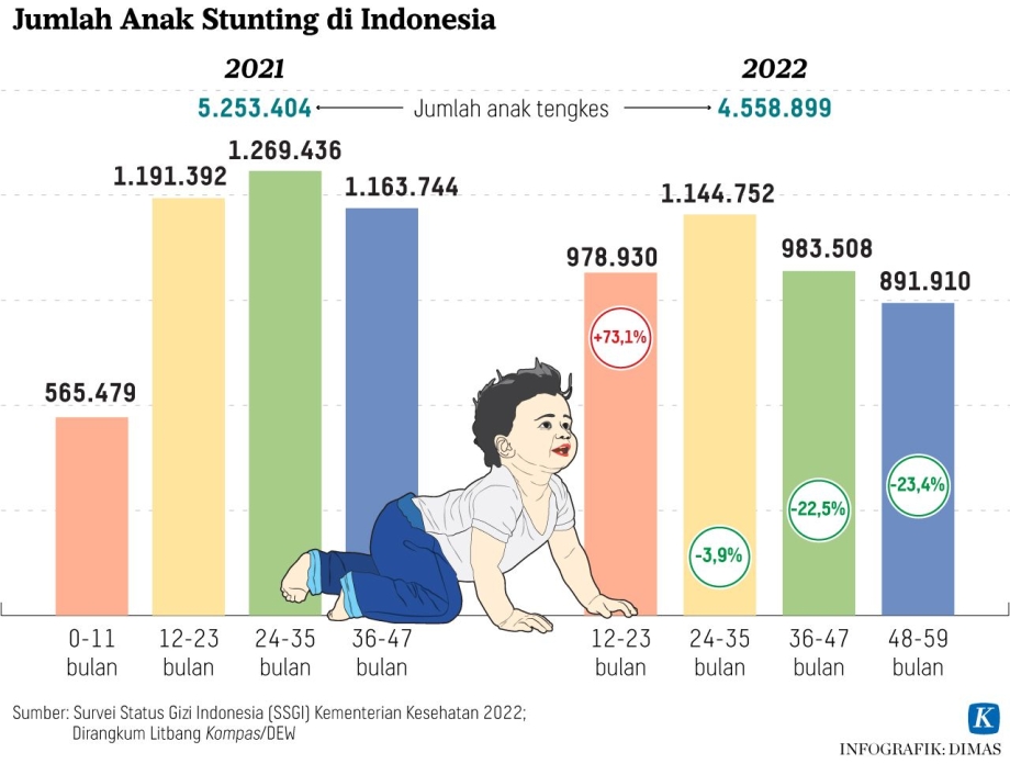Pada tahun 2024, penurunan angka stunting di Indonesia dikejar sesuai target turun menjadi 14 persen. Tahun 2022, angka tengkes 21,6 persen dan tahun 2021 angkanya mencapai 24,4 persen. Percepatan penurunan dilakukan dan tahun ini melibatkan 17 kementerian/lembaga, termasuk melibatkan pihak swasta.