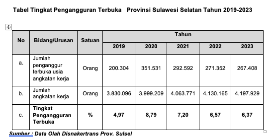 Mengacu pada Renstra perubahan 2018-2023 Dinas Tenaga Kerja dan Transmigrasi Provinsi Sulawesi Selatan yang telah ditetapkan, terdapat capaian dan target sasaran Tingkat Pengangguran Terbuka daritahun 2019-2023 sebagai berikut: