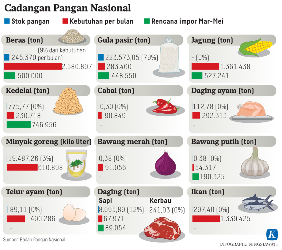 Kondisi itu ditandai beberapa hal. Pertama, alokasi anggaran pembangunan kementerian/lembaga (K/L) bidang pangan sangat cekak. Kedua, terjadi penurunan produksi pangan yang sangat signifikan (utamanya beras).