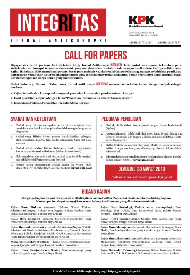 Jurnal Integritas KPK : Call for Papers sebelum 30 Maret 2019! Info lengkap di http://jurnal.kpk.go.id