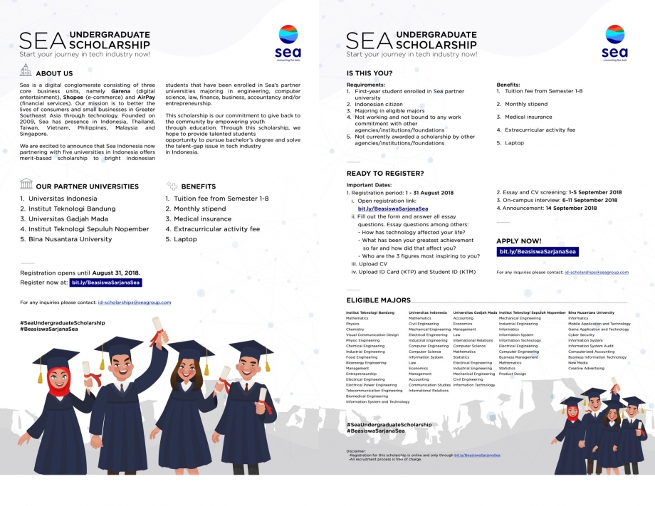 Sea is a digital conglomerate consisting of three core business units, namely Garena (digital entertainment), Shopee (e-commerce) and AirPay (financial services). Our mission is to better the lives of consumers and small businesses in Greater Southeast Asia through technology. Founded in 2009, Sea has presence in Indonesia, Thailand, Taiwan, Vietnam, Philippines, Malaysia and Singapore.We are excited to announce that Sea Indonesia now partners with five universities in Indonesia offering merit-based scholarship to bright Indonesian students that have been enrolled in Sea’s partner universities majoring in engineering, computer science, law, finance, business, accountancy and/or entrepreneurship.
