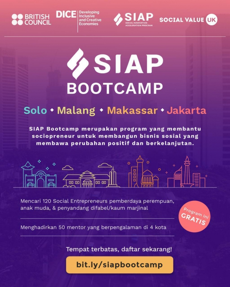 SIAP Bootcamp merupakan program kolaborasi antara SIAP sebagai akselerator bisnis social dan Social Value UK yang didukung oleh British Council melalui program DICE. Tiga tema utama dalam program ini adalah pemberdayaan anak muda, pemberdayaan perempuan, dan pemberdayaan penyandang difabel/kaum marjinal.
