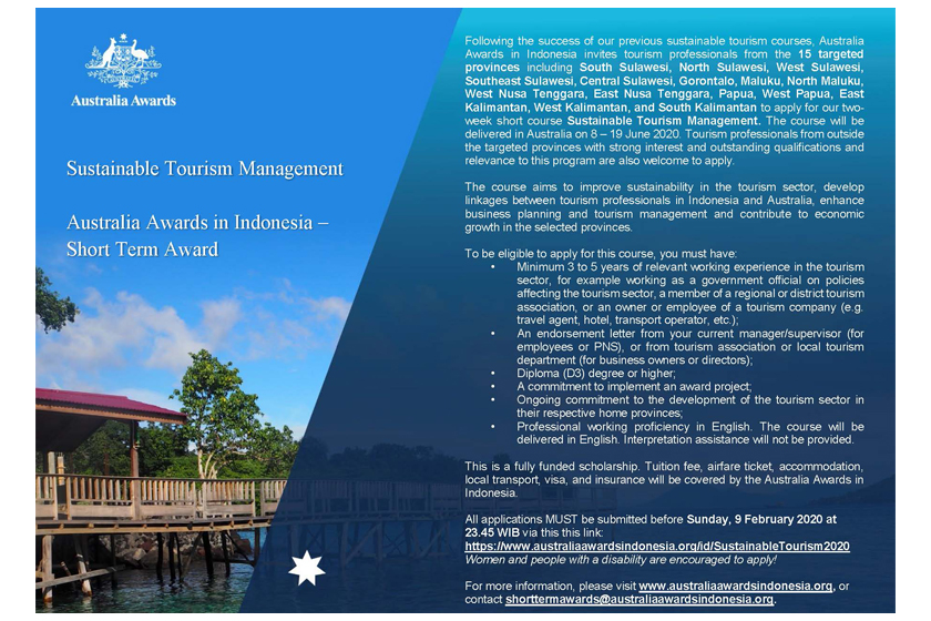 Following the success of our previous sustainable tourism courses, Australia Awards in Indonesia invites tourism professionals from the 15 targeted provinces including South Sulawesi, North Sulawesi, West Sulawesi, Southeast Sulawesi, Central Sulawesi, Gorontalo, Maluku, North Maluku, West Nusa Tenggara, East Nusa Tenggara, Papua, West Papua, East Kalimantan, West Kalimantan, and South Kalimantan to apply for our two-week short course Sustainable Tourism Management. The course will be delivered in Australia on 8 – 19 June 2020. Tourism professionals from outside the targeted provinces with strong interest and outstanding qualifications and relevance to this program are also welcome to apply.
