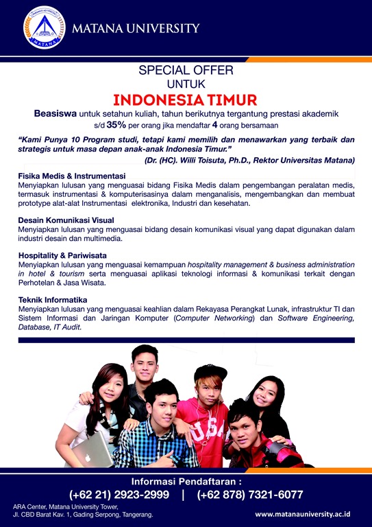 Informasi lebih lanjut dapat diperoleh melalui 02129232999 atau 087873216077 dan www.matanauniversity.ac.id