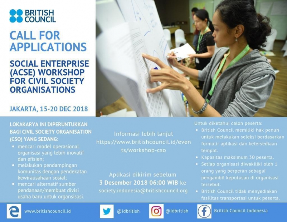 Call for Applications Social Enterprise (ACSE) Workshop for Civil Society Organisations Jakarta, 15-20 Des 2018 Informasi lebih lanjut dan mengunduh formulir aplikasi: https://www.britishcouncil.id/events/workshop-cso Kirimkan formulir aplikasi ke Society.indonesia@britishcouncil.org sebelum 3 Des 2018
