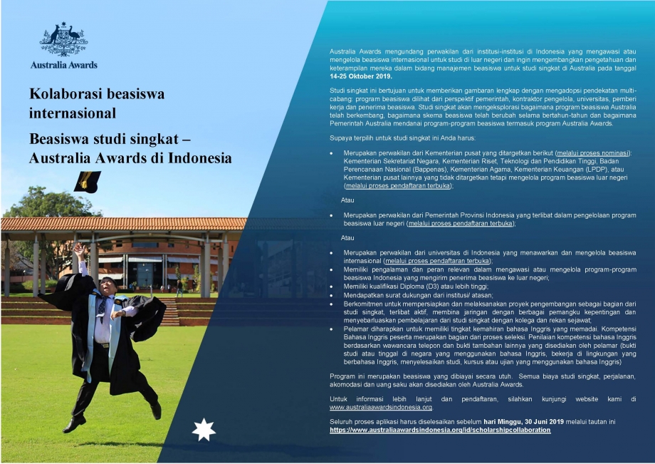 Australia Awards in Indonesia invites existing/emerging leaders from Disabled People’s Organisations (DPOs) with experience in providing advocacy for policy implementation to apply for our two-week short course on Role of Disabled People’s Organisations in the Implementation of Policy Reform in Australia on 20 January – 31 January 2020.