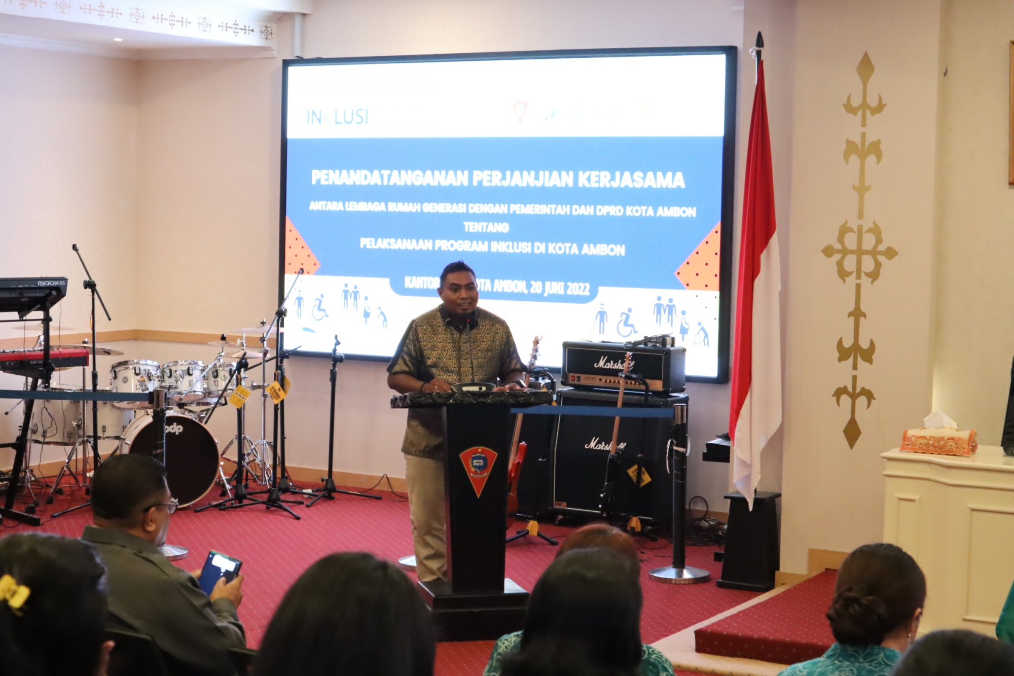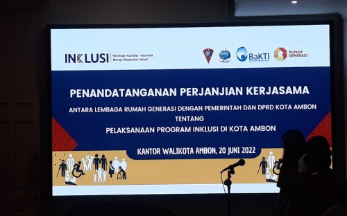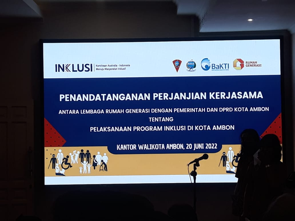 Senin, 20 Juni 2022 bertempat di Kantor DPRD Kota Ambon, Rumah Generasi Ambon melakukan Penandatanganan Perjanjian Kerjasama/MOU dengan Pemerintah Kota Ambon dan DPRD Kota Ambon, tentang Pelaksanaan Program Kemitraan Australia-Indonesia Menuju Masyarakat Inklusif atau Program INKLUSI. Penandatanganan Perjanjian Kerjasama tersebut menandai dimulainya Program INKLUSI di Kota Ambon.