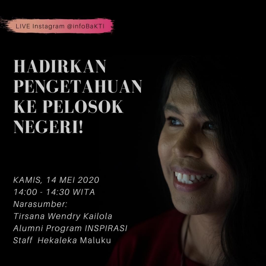2. Tanggal 14 Mei 2020 dengan narasumber Tirsana Wendry Kailola, alumni program INSPIRASI 2018 dan staf Hekaleka Maluku. Tirsa berbagi cerita tentang Program Pengembangan dan Pendidikan Anak Usia Dini (PAUD), sebuah program pelatihan untuk para pendidik PAUD dalam berbagai kegiatan pengembangan dan peningkatan guru dan anak di di 3 pulau terpencil di Maluku yakni Pulau Saparua, Pulau Kisar dan Pulau Moa. Sebuah kebanggaan dan keharuan bagi Tirsa ketika melihat guru dan orang tua telah berubah sikap dan terhadap anak dimana awalnya pendekatan ke ke anak sangat keras dan kadang menggunakan fisik akhirnya berubah dengan penuh kasih sayang setelah mengikuti program ini. Selama masa pandemi COVID-19 ini, Tirsa dan Hekaleka membuat kelas parenting dan lomba kreasi anak secara online. Manfaat dari kegiatan ini, selain memberikan edukasi positif kepada orangtua tentang cara mendidik anak, juga menjadi langkah awal untuk memperkenalkan model pembelajaran online bagi para orang tua dan anak.