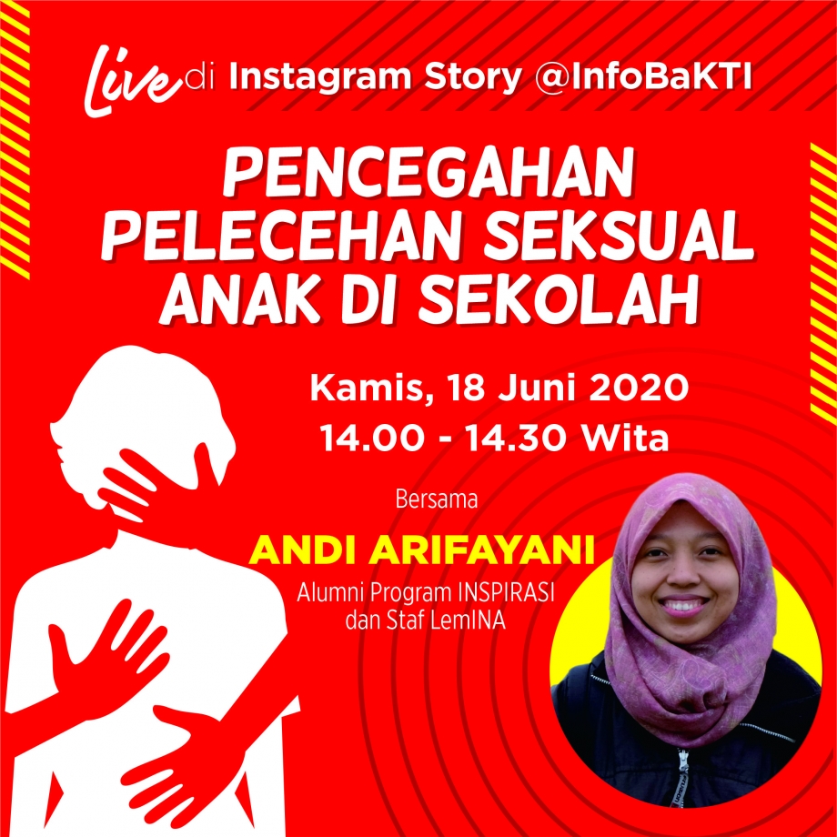 4. Tanggal 18 Juni 2020 dengan narasumber Andi Arifayani alumni program INSPIRASI 2018 dan staf LemINA Makassar. Ifa berbagi cerita tentang Program Pencegahan Pelecehan Seksual terhadap Anak di Sekolah. Lewat program ini, guru di salah satu sekolah dasar terpilih di Makassar diberikan pelatihan dan pengenalan modul yang terbagi dalam beberapa bagian besar yaitu mengenali anggota tubuh, mengenali lingkungan sekitar, berani menolak dan berkata tidak, serta mengenal jenis-jenis rahasia. Untuk kelas lebih tinggi yaitu kelas 5-6 diberikan tambahan materi tentang mencegah pornografi. Modul ini dapat diakses di website www.lemina.org