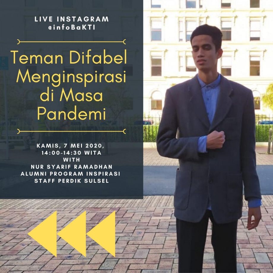 1. Tanggal 7 Mei 2020, narasumber Nur Syarif Ramadhan, Alumni Program INSPIRASI 2019 dan Staf PerDIK (Pergerakan Difabel Indonesia untuk Kesetaraan) Sulawesi Selatan. Syarif berbagi pengalaman selama di Selandia Baru, bagaimana pemerintah di sana mengakomodasi warga difabel dalam mengakses pendidikan inklusif dan berkesempatan mengunjungi salah satu institusi pendidikan inklusif bernama BLENNZ (Blind and Lowvision Education Network New Zealand). BLENNZ adalah tempat rehabilitasi sosial bagi seorang blind atau low-vision yang baru menjadi difabel ketika dewasa. Setelah kembali ke Indonesia akhir 2019, Syarif menginisiasi terbentuknya kelompok mahasiswa dan pelajar yang nantinya akan mengadvokasi pemerintah maupun pengelola pendidikan untuk mengupayakan tersedianya berbagai macam aksesibilitas yang dapat menunjang kemandirian seorang pelajar dan mahasiswa disabilitas di lingkungan kampus dan sekolah hingg terbentuknya komunitas GEMPARKAN (Gerakan Mahasiswa dan Pelajar untuk Inklusi dan Kesetaraan). Di masa pandemi COVID-19, Syarif bersama PerDIK Sulsel bergerak menolong sesama kaum difabel khususnya lansia yang terdampak ekonomi dengan mengumpulkan dan menyalurkan donasi berupa sembilan bahan pokok.