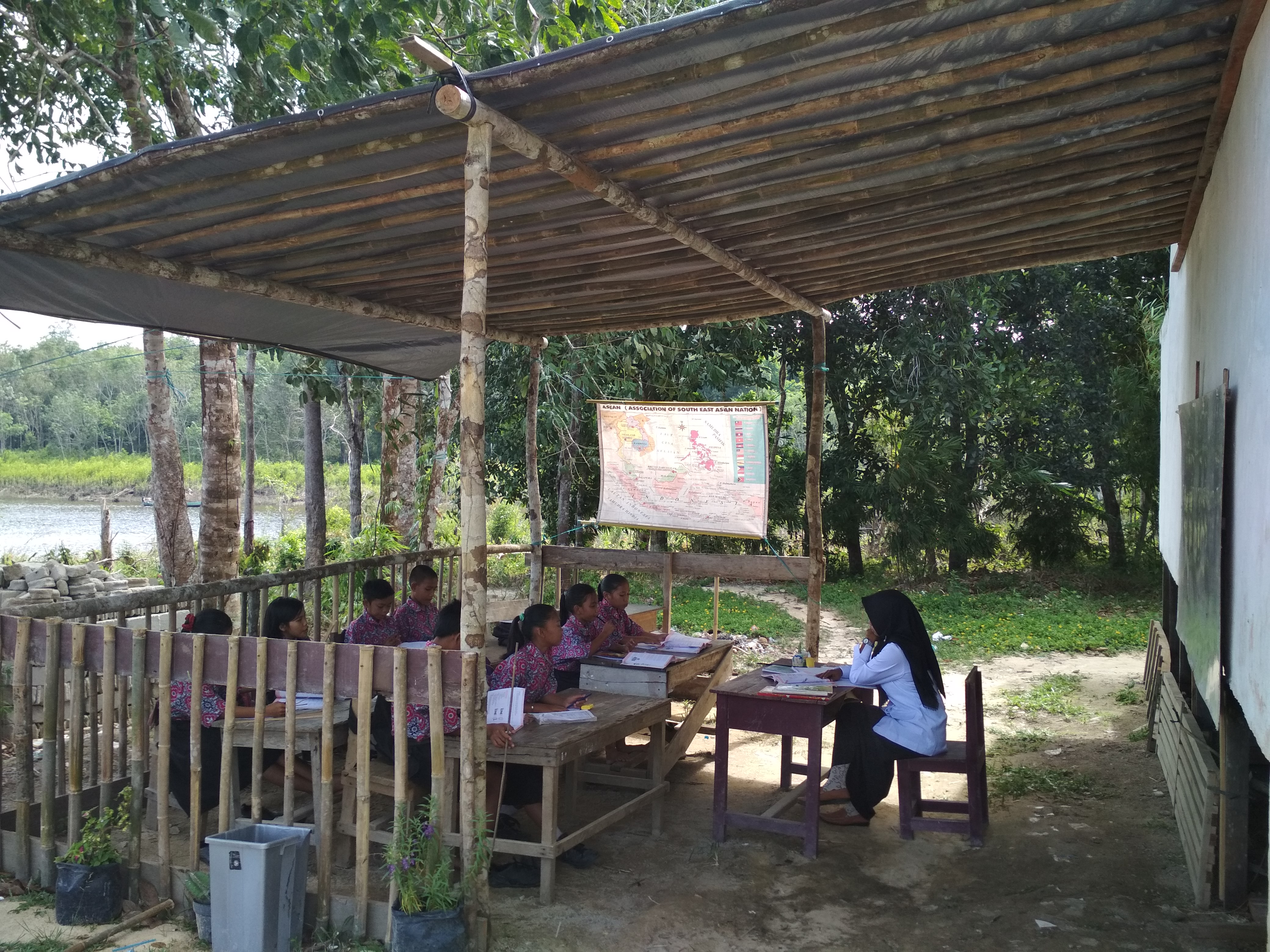 Siang itu-ditemani Kader Desa Batu Sedau, bernama Dewi, kami berjalan menyusuri jembatan dan memasuki lapangan sekolah. Dari jauh nampak biasa saja, setelah mendekat, mata saya tertuju pada sebuah tenda di samping dinding kantor sekolah. Terlihat jelas seorang guru yang kemudian saya tahu bernama Ibu Rusma bersama siswa didiknya di kelas lima sedang asik belajar.