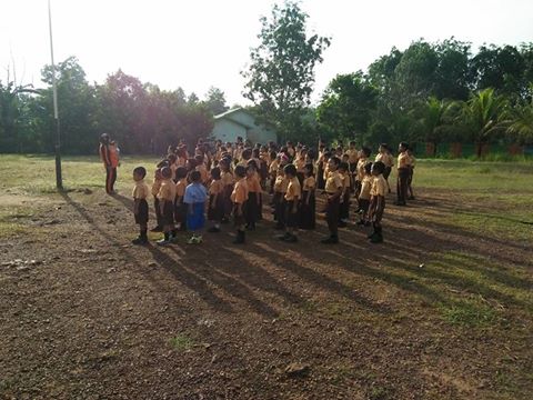 Salah satu lagi yang dinyanyikan adalah lagu kebangsaan Indonesia Raya. Sejenak saya mengira-ngira mungkin guru dan anak-anak tersebut sedang menggelar upacara bendera. Batinku bertanya, “Ini kan hari Sabtu, bagaimana bisa ada upacara bendera?”. Dipenuhi rasa penasaran, saya pun beranjak dari Rumah Guru Sekolah, sebuah rumah dinas sangat sederhana yang diperuntukkan bagi tenaga pengajar di daerah pedalaman, untuk mengetahui lebih lanjut apa yang terjadi.