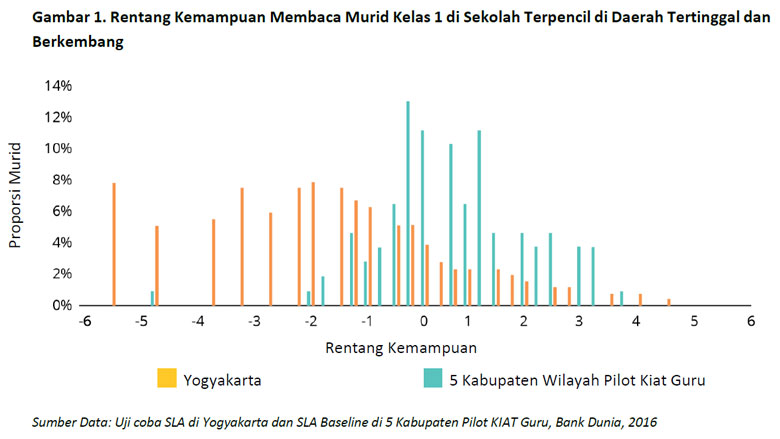 SLA telah diujicobakan dan diujikan ke 64.565 murid dari 324 sekolah dasar terpencil di delapan provinsi di Indonesia. Uji coba SLA mencakup sekolah-sekolah daerah terpencil baik di kabupaten yang berkembang maupun tertinggal. Gambar 1 menunjukkan hasil uji coba di tingkat kelas 1, di mana distribusi hasil membaca untuk murid di 270 sekolah terpencil yang didukung KIAT Guru tersebar lebih merata di seluruh rentang kemampuan. Akan tetapi, tes ini lebih mudah bagi murid dari sekolah-sekolah terpencil di Daerah Istimewa Yogyakarta yang merupakan wilayah yang berkembang, dengan rentang hasil tes kemampuan mereka berkisar dari menengah hingga tinggi. Tren ini juga berlaku untuk murid kelas 1 di bidang matematika, seperti yang digambarkan pada Gambar 2, dan di tingkat kelas lainnya.