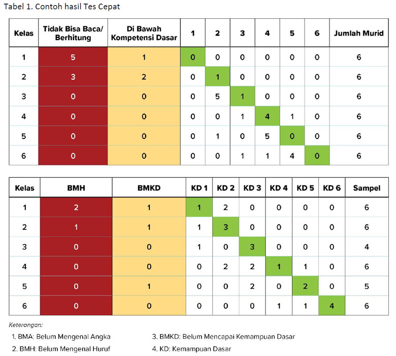 Dari masing-masing tingkat kelas, enam murid dipilih secara acak untuk mewakili kemampuan tingkat kelas mereka, dengan pemilihan yang memastikan keseimbangan secara gender. Pertanyaan tersulit yang dapat dijawab oleh murid menandai kompetensi tingkat kemampuan mereka. Hasil tes murid dipetakan ke dalam peta visual (Gambar 3) yang menunjukkan tingkat kemampuan yang mereka peroleh di sepanjang proses belajar. Jika keterampilan murid berada sesuai dengan tingkat kelasnya, maka ia dicatat dalam kotak berwarna hijau. Murid yang tertinggal tercatat di sebelah kiri kotak hijau, begitu pula mereka yang belum mengenal huruf atau belum mengenal angka. Tabel 1 menyajikan contoh hasil Tes Cepat dari suatu sekolah.