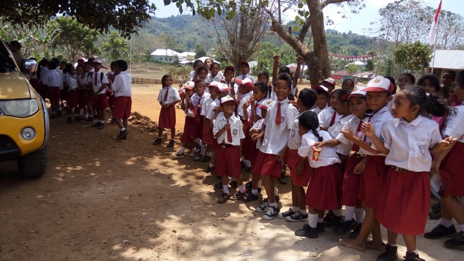Keluar dari kendaraan kami langsung disambut siswa berseragam merah putih, bersahut sahutan mengucapkan selamat datang sambil mendekat dan mengulurkan tangan untuk bersalaman. Anak anak yang nampak riang gembira, terlihat senang berada di sekolah.