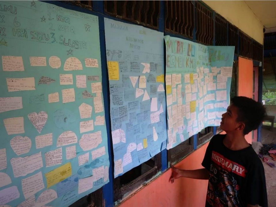 Begitulah beberapa coretan sederhana yang dibuat oleh murid yang ditempel bersama catatan lainnya di sebuah kertas karton biru yang terpampang di jendela kelas yang dijadikan media belajar oleh sekolah.