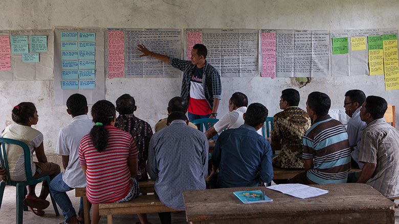 Setiap enam bulan sekali, para guru dan anggota komite pengguna layanan Sekolah Dasar Hawir mengevaluasi indikator perjanjian layanan pendidikan dengan menilai pelaksanaan, serta melakukan perbaikan yang diperlukan untuk perbaikan mutu pendidikan. (Photo: Fauzan Ijazah/Bank Dunia).