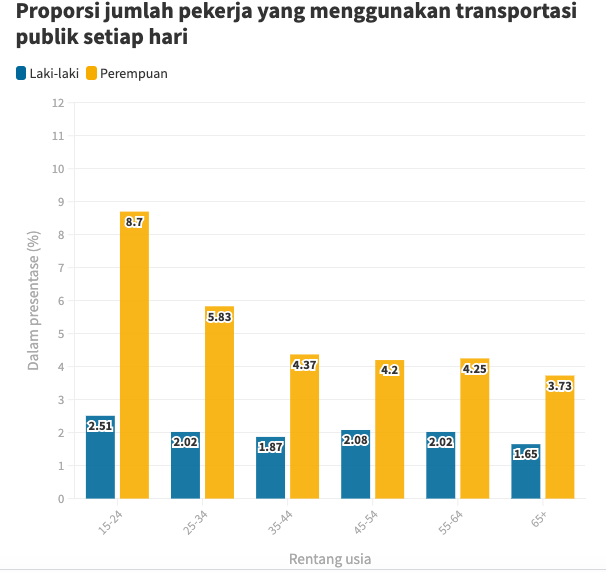 Dalam masyarakat Indonesia yang masih patriarkis, perempuan lebih sering menggunakan transportasi publik daripada laki-laki karena perempuan tidak memiliki kendaraan milik mereka sendiri.