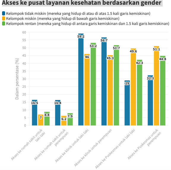 Penduduk miskin di Indonesia, secara umum, memiliki akses yang lebih terbatas ke rumah sakit dan cenderung pergi ke puskesmas untuk mendapatkan layanan kesehatan. Namun, lebih sedikit perempuan miskin (6,2%) dibandingkan laki-laki miskin (7%) untuk mengunjungi rumah sakit.