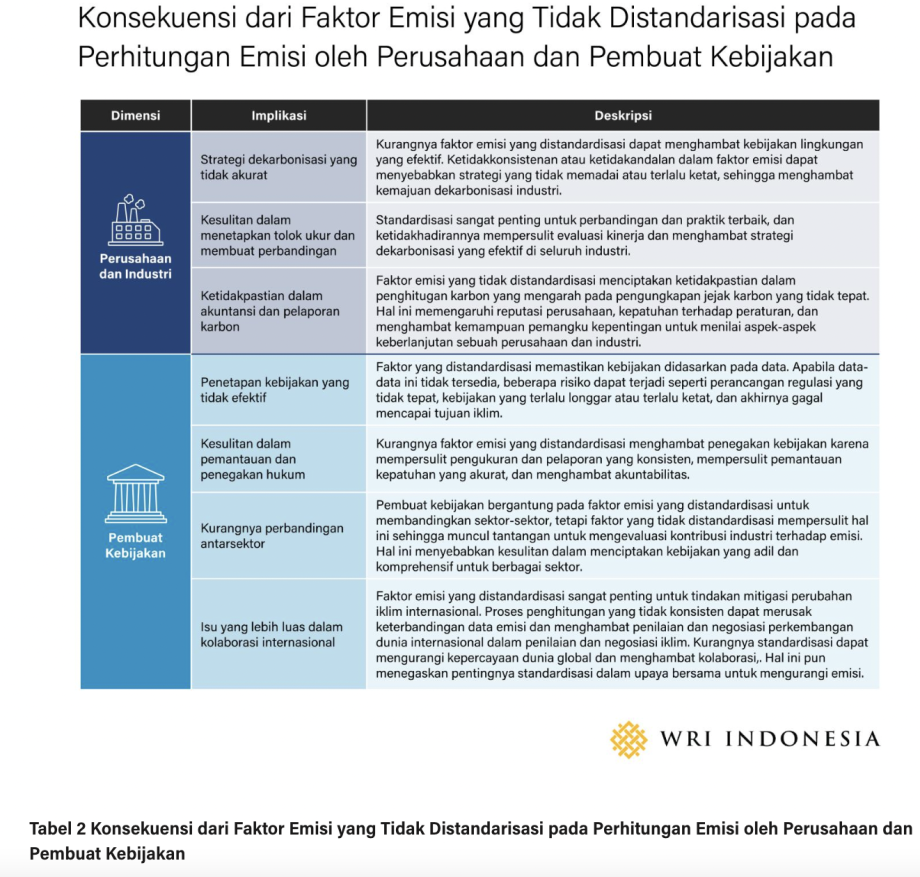 Saat ini, faktor emisi yang tersedia untuk sistem perhitungan GRK korporat di Indonesia memiliki berbagai dampak yang berlawanan. Faktor yang tidak akurat atau tidak dapat diandalkan dapat mengakibatkan perkiraan emisi yang terlalu rendah atau terlalu tinggi sehingga menghambat efektivitas strategi pengurangan emisi. Ketidakakuratan ini dapat menyebabkan investasi yang salah arah, alokasi sumber daya yang tidak efisien, dan kegagalan untuk menciptakan kemajuan yang berarti dalam inisiatif dekarbonisasi. Selain itu, ketiadaan faktor emisi yang terstandardisasi menghambat kemampuan untuk membandingkan industri berdasarkan kinerja lingkungan mereka sehingga menghalangi pembentukan tolok ukur dan target pengurangan yang jelas.