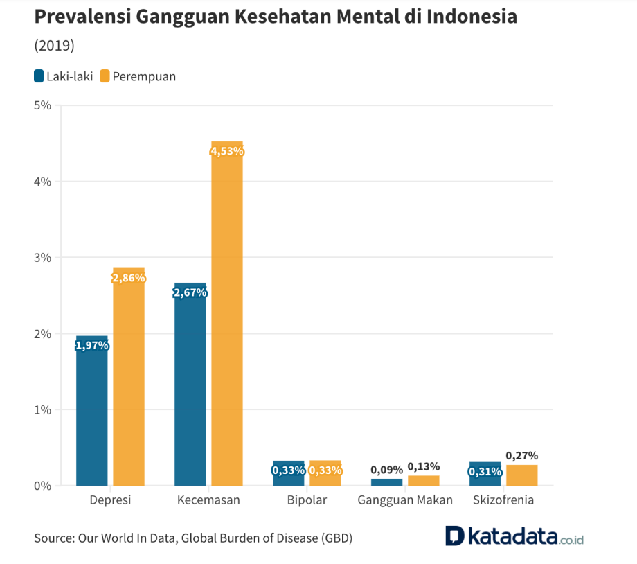 Sebagaimana tubuh atau fisik yang dapat terkena penyakit, kondisi psikis seseorang juga dapat terganggu. Gangguan kesehatan jiwa atau mental ini dapat menyerang siapa saja, lelaki atau perempuan. Orang dewasa hingga anak-anak. Secara tren, gangguan kesehatan mental di Indonesia meningkat dalam tiga dekade terakhir. Data menunjukkan, perempuan lebih rentan menderita gangguan mental, seperti depresi hingga kecemasan berlebihan, daripada laki-laki. Kendati begitu, jika ditangani dengan tepat penderita penyakit jiwa dapat hidup dan beraktivitas normal. Dalam definisi Organisasi Kesehatan Dunia (WHO), penyakit kejiwaan ditandai dengan gangguan yang terjadi secara klinis pada kognisi, pengaturan emosi, atau perilaku seseorang. Gangguan kesehatan mental ini mencakup banyak bentuk, termasuk depresi, kecemasan, bipolar, gangguan makan, dan skizofrenia. Riset dari Institute for Health Metrics and Evaluation University of Washington terkait Global Burden of Disease (GBD) 2019 menunjukkan, tingkat prevalensi gangguan mental di Indonesia beragam. Prevalensi terbesar adalah depresi dan kecemasan. Dari riset tersebut terlihat, prevalensi perempuan yang mengalami depresi di Indonesia sebesar 2,9% dari populasi. Artinya, sekitar 8 juta perempuan dari sekitar 270 juta penduduk mengalami gangguan depresi. Angka ini lebih tinggi dari prevalensi laki-laki dengan gangguan serupa yakni hanya 2% atau sekitar 5 juta orang. Sementara itu, prevalensi gangguan kecemasan pada perempuan di Indonesia mencapai 4,5%. Jumlahnya hampir dua kali lipat dibandingkan laki-laki. Begitu pula perempuan memiliki prevalensi gangguan makan lebih tinggi. Dilihat dari trennya, gangguan kesehatan mental di Indonesia mengalami peningkatan, terutama pada perempuan yang mengalami depresi, kecemasan, dan gangguan makan.