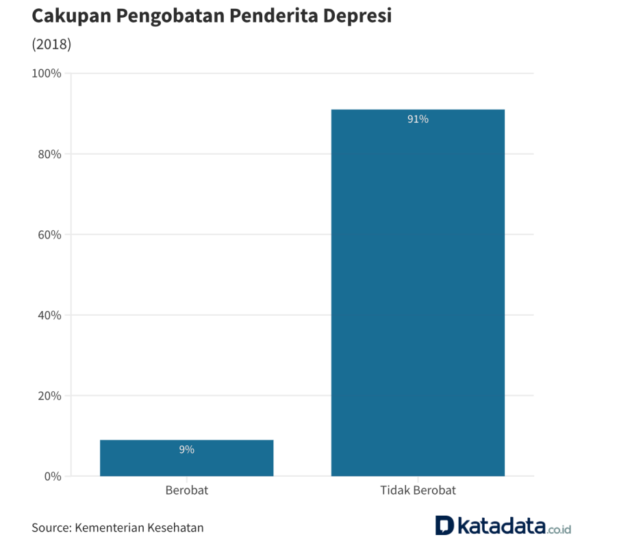 Selain itu masih minimnya pelayanan dan fasilitas kesehatan mental di berbagai daerah membuat banyak penderita yang tidak tertangani. Hanya 9% penduduk yang mendapatkan pengobatan untuk gejala depresi dan 91% tidak menjalani pengobatan. Padahal depresi adalah awal dari gejala gangguan jiwa yang lebih berat.