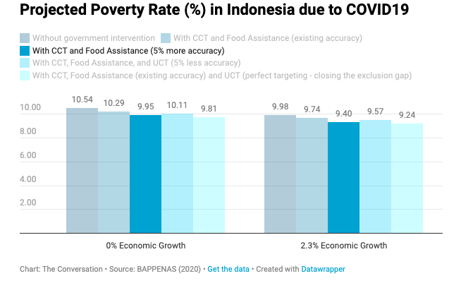Model kami menunjukkan bahwa apabila pertumbuhan ekonomi turun menjadi nol persen, angka kemiskinan akan meningkat jadi 10.54% atau menyeret setidaknya 3,63 juta penduduk ke dalam kemiskinan. Angka tersebut akan menambah 24,79 juta orang miskin yang tercatat pada September 2019.