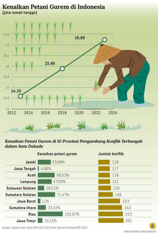 Pada 2013 jumlah petani gurem 14,25 juta rumah tangga petani (RTP), sepuluh tahun kemudian meningkat menjadi 16,89 juta RTP. Terjadi peningkatan 2,64 juta RTP, meningkat rata-rata 1,9 persen per tahun.