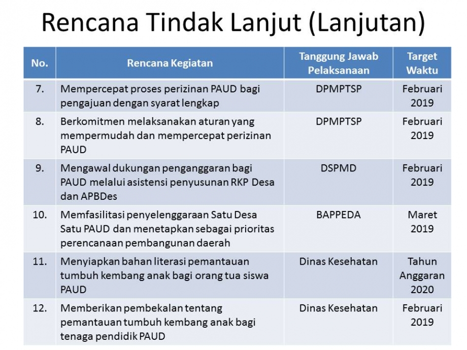 Dalam pendirian PAUD tidak saja Dinas Pendidikan dan Dinas Sosial dan Pemberdayaan Masyarakat & Pemerintah Desa (DSPMD) yang terlibat, namun Dinas Penanaman Modal dan Pelayanan Terpadu Satu Pintu (DPMPTSP) terkait dengan perizinan pendirian PAUD yang selama ini tidak terfikirkan oleh Dinas Pendidikan dan Kebudayaan dan DSPMD.