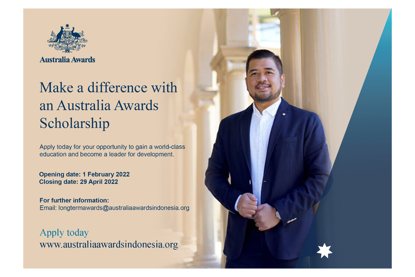 Do you want to be a leader in your field and join an inspiring network of changemakers? Apply now for an Australia Awards Scholarship. The applications open on 1 February 2022 and close on 29 April 2022 at 20.59 WIB.