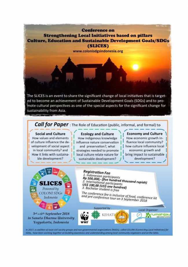 Indonesia akan mengadakan Konferensi Internasional SLICES (Conference of Strengthening Local Initiatives based on pillars Culture, Education and Sustainable Development) yang akan dilaksanakan pada tanggal 3-6 September 2018 di Yogyakarta.