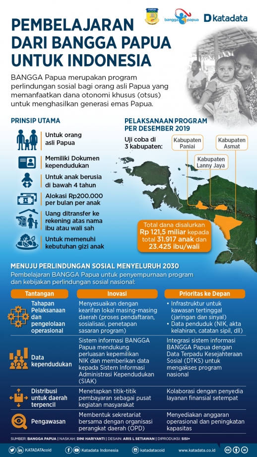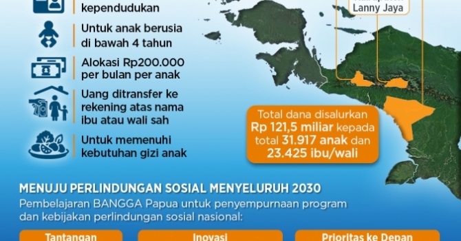 BANGGA Papua merupakan program khusus dari pemerintah provinsi untuk orang asli Papua, dengan memanfaatkan dana otonomi khusus (otsus). Program ini bertujuan agar penduduk asli dapat mengatasi permasalahan gizi buruk serta meningkatkan kesehatan anak-anaknya. Per Desember 2019, pelaksanaan program BANGGA Papua sudah diujicobakan di tiga kabupaten yaitu Kabupaten Asmat, Kabupaten Paniai, dan Kabupaten Lanny Jaya. Total dana yang disalurkan mencapai Rp 121,5 miliar kepada 31.917 anak dan 23.425 ibu/wali. BANGGA Papua diharapkan dapat menjadi pembelajaran bagi Indonesia dalam menjalankan perlindungan sosial secara menyeluruh pada 2030. Ada beberapa tantangan utama di lapangan, yaitu pengelolaan operasional, ketersediaan data kependudukan, teknis penyalurannya, dan pengawasan. Editor: Padjar Iswara