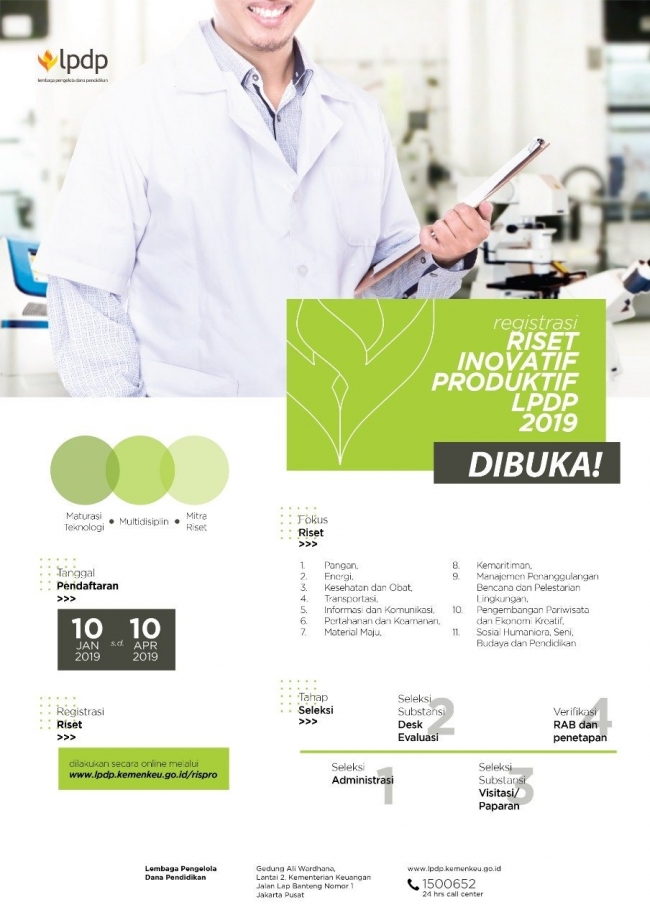 Sesuai dengan salah satu misi strategis LPDP, program Riset Inovatif Produktif (RISPRO) kembali dibuka pada tahun 2019.