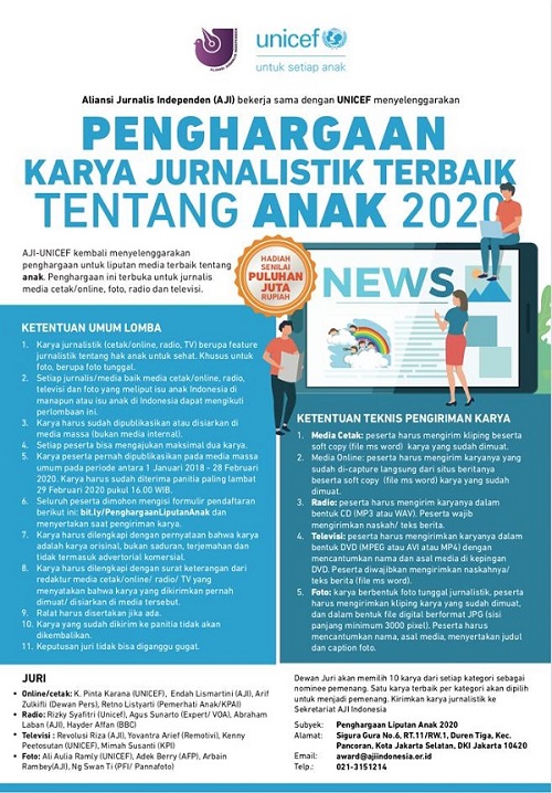 AJI-UNICEF kembali menyelenggarakan penghargaan untuk liputan media terbaik tentang anak. Penghargaan ini terbuka untuk jurnalis media cetak/online, foto, radio dan televisi.