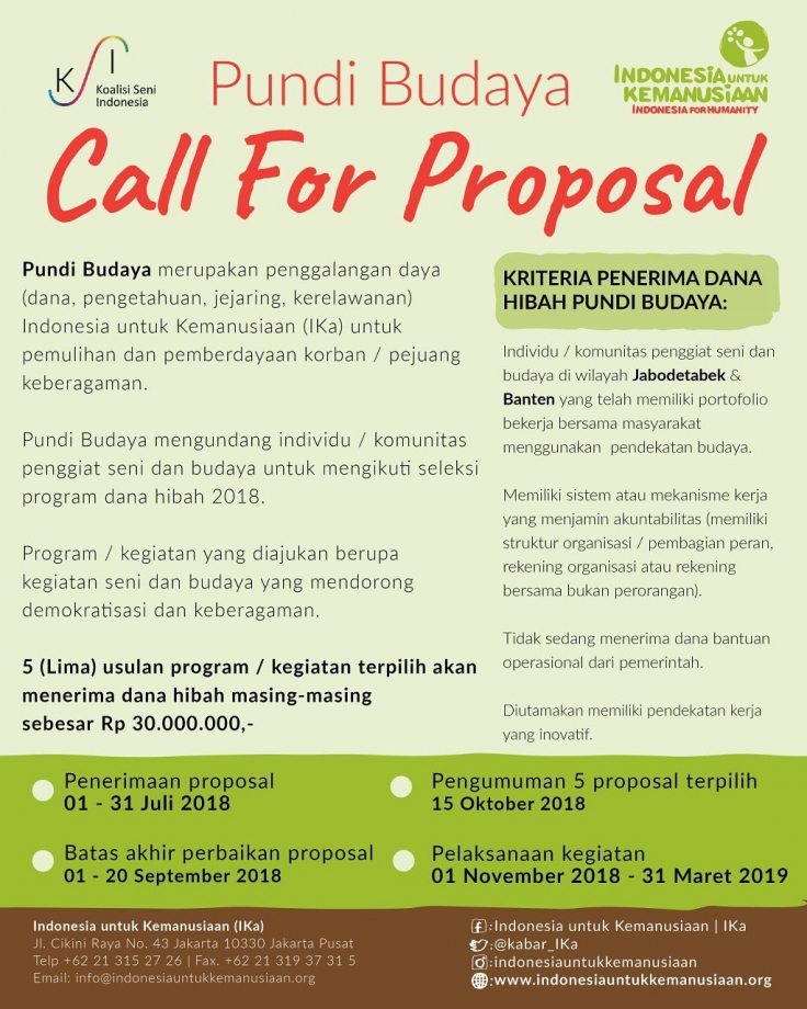 Pundi Budaya salah satu dari empat penggalangan daya Indonesia untuk Kemanusiaan (IKa) mengundang individu/komunitas pegiat seni dan budaya untuk mengikuti seleksi dana hibah tahun 2018.