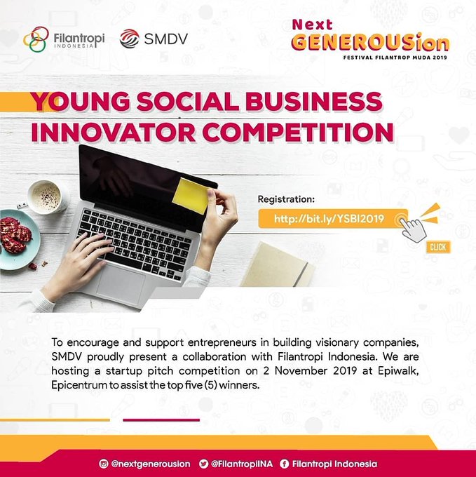 To encourage and support entrepreneurs in building visionary companies, SMDV proudly presents a collaboration with Filantropi Indonesia. We are hosting a startup pitch competition on 2 November 2019 at Epiwalk, Epicentrum to assist the top five (5) winners.