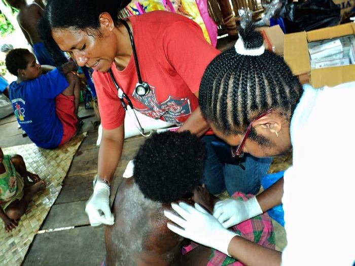 dr. Mia sedang mengobati penderita sakit kulit atau “garai” dalam istilah setempat. Garai adalah jenis penyakit yang paling banyak dijumpai dr. Mia di Kampung Esrotnamba, Kaimana. (Foto: Dok. pribadi dr. Mia Rumateray)