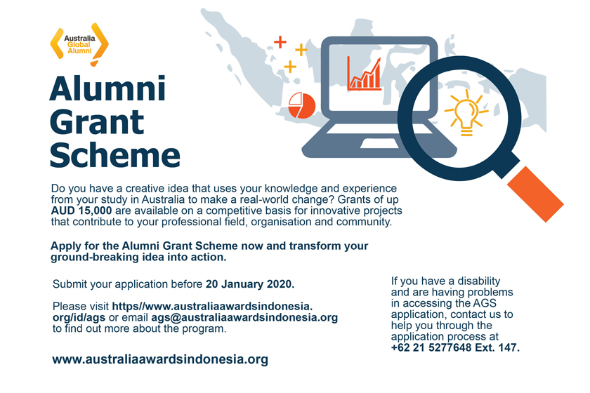 The AGS offers seed funding on a competitive basis for initiatives that create impact by putting your knowledge and skills to good use. The program provides up to AU$15,000, and up to 25 grants are available under the current AGS round. The AGS is open to all Indonesian nationals who have graduated from a recognised Australian tertiary institution, including those who are self-funded. It is also open to alumni of short-term studies or programs in Australia. See the guidelines - Submit your applications before 20 January 2020 at this link.